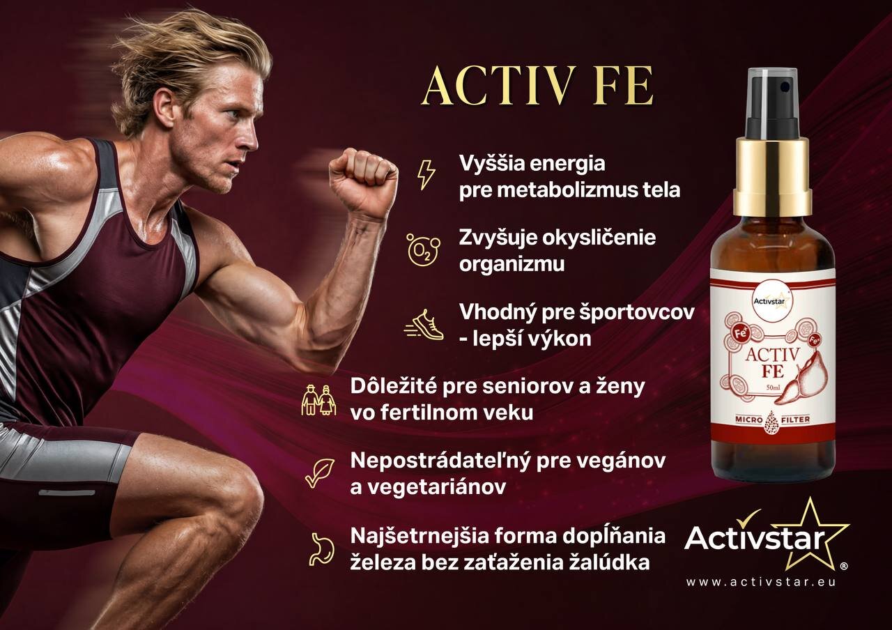 ACTIV FE je tekutý výživový doplnok na doplnenie železa do organizmu na báze glukonátu Železnatého (Fe²⁺) – dvojmocného železa s najvyššou biologickou dostupnosťou. Podáva sa sublingválne – priamo do ústnej dutiny, kde sa začína vstrebávanie ešte pred príchodom do tráviacej sústav. Na rozdiel od tabliet alebo kvapiek obsahujúcich síran železnatý (FeSO₄) alebo hydroxidy železa (Fe(OH) 3 ), ACTIV FE kombinuje tri aktívne zložky do synergického systému pre maximálnu efícienciu.