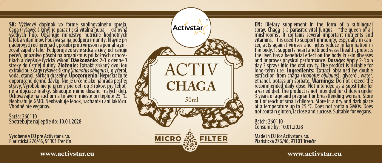 Výživový doplnok vo forme sublingválneho spreja s extraktom z čagy (ryšavec šikmý), známej ako kráľovná všetkých húb. Obsahuje množstvo cenných živín a vitamínov.