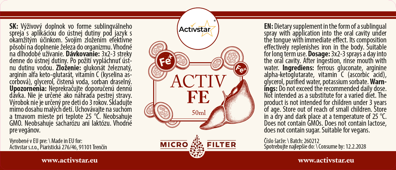 ACTIV FE je prémiový výživový doplnok vo forme sublingválneho spreja, navrhnutý pre maximálne efektívne dopĺňanie železa do organizmu. Vďaka aplikácii pod jazyk dochádza k okamžitému vstrebávaniu účinných látok priamo do krvného obehu, čím sa obchádza tráviaci trakt a zvyšuje sa celková využiteľnosť produktu.