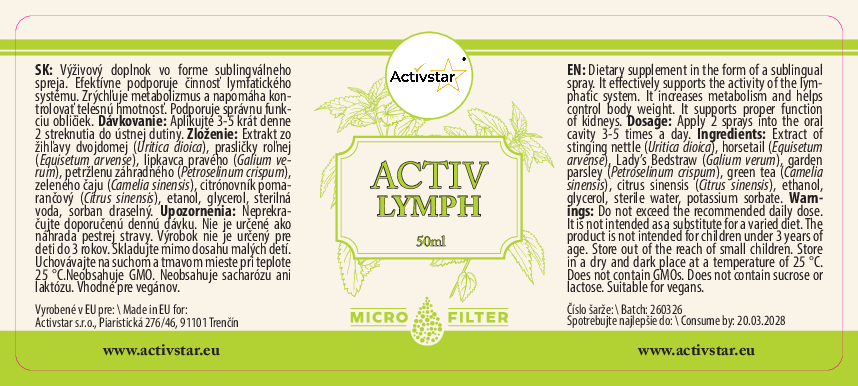 Podporte svoj lymfatický systém jednoducho a efektívne! Activ Lymph spray je prírodný sublingválny sprej, ktorý využíva silu bylinných extraktov na podporu správneho fungovania lymfatického systému. Pomáha telu prirodzene odvádzať toxíny, nadbytočné tekutiny a posilňuje imunitný systém.