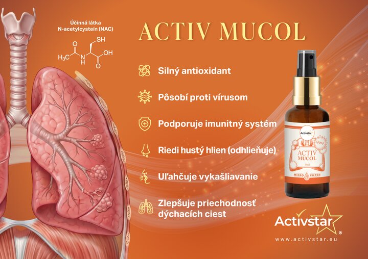 Activ Mucol je výživový doplnok vo forme sublingválneho spreja, ktorý pomáha riediť hlieny a podporuje vykašliavanie. Je vhodný pri ťažkostiach spojených s hornými aj dolnými dýchacími cestami a zároveň prispieva k podpore imunity.