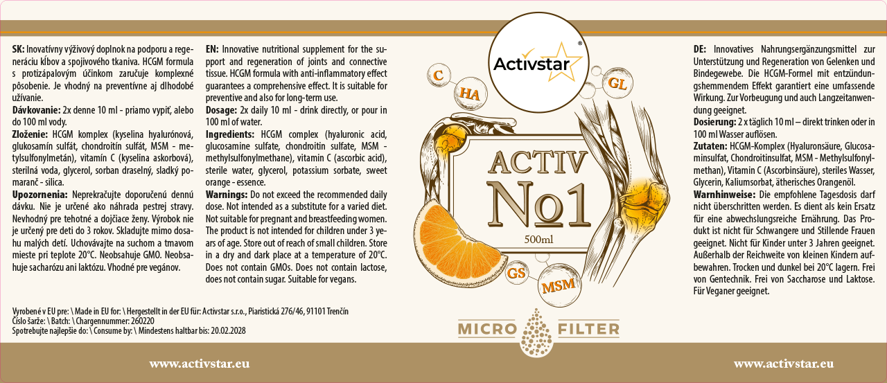 ACTIV No1 je inovatívny tekutý výživový doplnok na podporu kĺbov, regeneráciu chrupaviek a výživu spojivových tkanív. Obsahuje účinný HCGM komplex (kyselina hyalurónová, glukosamín, chondroitín, MSM) doplnený o vitamín C, ktorý prispieva k tvorbe kolagénu pre správnu funkciu kostí a chrupaviek.