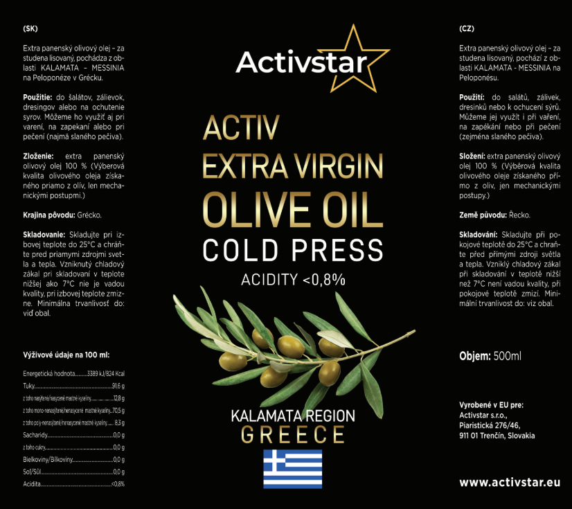 Objavte Extra panenský olivový olej Activstar z oblasti Kalamata – 100% prírodný, za studena lisovaný, bez chémie. Bohatá ovocná chuť, plný antioxidantov a zdravých tukov. Skvelý do šalátov, na varenie aj pečenie.