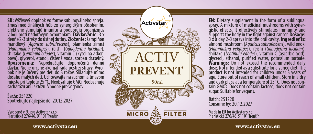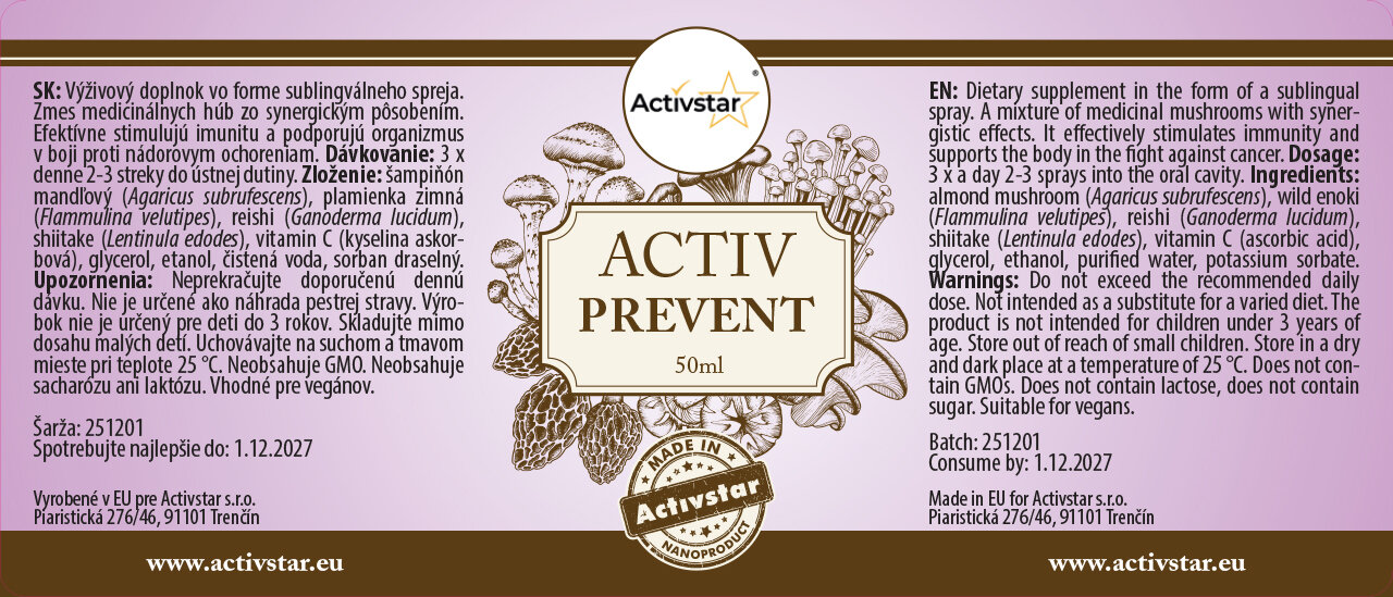 ACTIV PREVENT je výživový doplnok vo forme sublingválneho spreja, ktorý spája silu medicinálnych húb so synergickým účinkom. Podporuje imunitný systém, vitalitu organizmu a prispieva k ochrane buniek. Vďaka sublingválnemu podaniu sa účinné látky rýchlo vstrebávajú už v ústnej dutine.