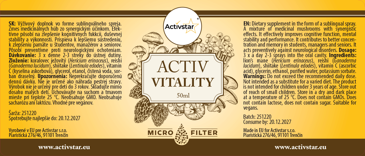 ACTIV VITALITY je výživový doplnok vo forme sublingválneho spreja, ktorý spája silu medicinálnych húb so synergickým účinkom. Podporuje kognitívne funkcie, sústredenie, pamäť a duševnú výkonnosť. Je ideálny pre študentov, manažérov, seniorov a všetkých, ktorí chcú posilniť mentálnu vitalitu a odolnosť.