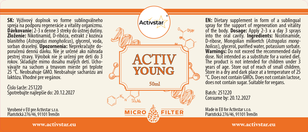 Activ YOUNG je výživový doplnok vo forme sublingválneho spreja, ktorý podporuje obnovu buniek, vitalitu a energiu organizmu. Vďaka unikátnemu zloženiu pôsobí rýchlo a efektívne – vstrebáva sa už v ústnej dutine.