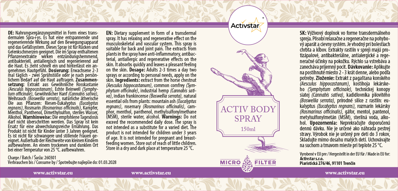 ACTIVBODY SPRAY je inovatívny výživový doplnok vo forme transdermálneho spreja. Je navrhnutý pre každého, kto hľadá efektívnu a rýchlu pomoc pri starostlivosti o svoje telo a potrebuje podporiť regeneráciu po náročnom dni alebo športovom výkone.